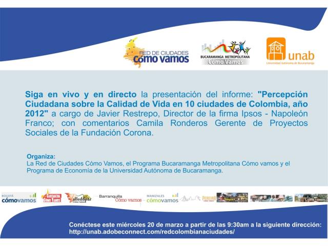 El 20 de marzo de 2013, en Bucaramanga, se presentaron los resultados más importantes del análisis comparativo de las Encuestas de Percepción Ciudadana aplicadas por los diez programas de la Red Cómo Vamos en Colombia.