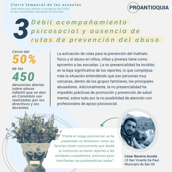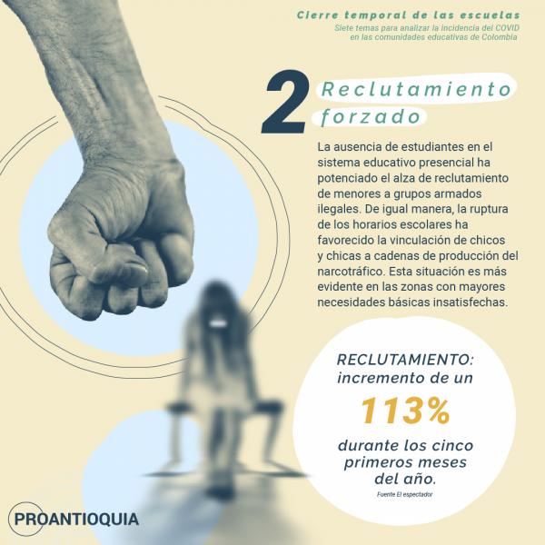 A continuación, podrán ver siete temas que han surgido por cuenta del cierre temporal de las escuelas en el marco de la pandemia. Queda una importante tarea: trabajar de manera conjunta para resolver el mayor número de aspectos negativos que evidenció este cierre y que podrán ayudar a que nuestros niños, niñas y adolescentes crezcan con unas garantías que todo Estado debe cumplir.