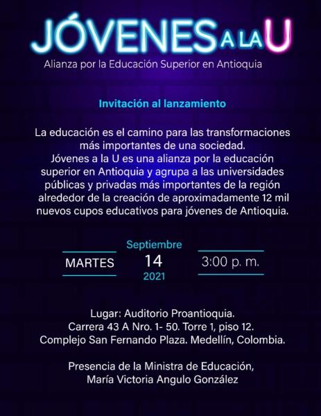 Jóvenes a la U es una alianza que articula a las principales universidades e instituciones técnicas y tecnológicas de Antioquia para ofertar aproximadamente 12 mil nuevos cupos en educación terciaria.