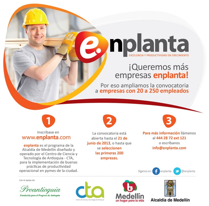 Enplanta es un Programa de la Alcaldía de Medellín diseñado y operado por el Centro de Ciencia y Tecnología de Antioquia – CTA y apoyado por Proantioquia, para la promoción, implementación y reconocimiento de buenas prácticas de productividad operacional en pymes de la ciudad, centrado en las personas que trabajan en planta. La convocatoria enplanta está abierta entre el 18 de marzo y hasta el 21 de junio de 2013 en Medellín, o hasta que se completen 200 empresas aptas para la implementación. Se comenzará a trabajar con las empresas a medida que ingresen al programa, cuya inscripción es gratuita.