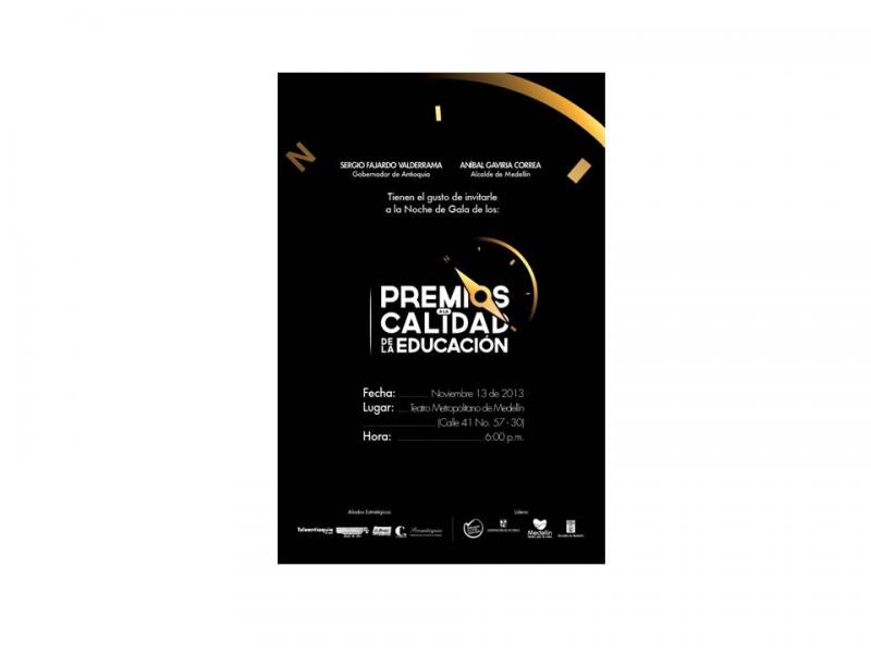 El Gobernador de Antioquia, Sergio Valderrama y el Alcalde de Medellín, Aníbal Gaviria tienen el gusto de invitarlos a la Noche de Gala de los Premios a la Calidad de la Educación, el 13 de noviembre de 2013, en el Teatro Metropolitano, a las 6 pm. Para ingresa re requiere invotación física.