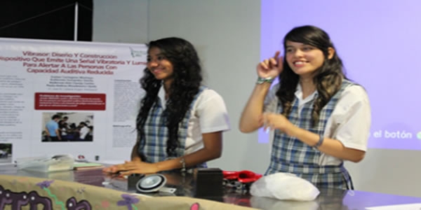 • Isamar Cartagena Montoya y Katherine Fernández Ávila de la IE Juan N. Cadavid de Itagüí y sus docente Anderson Clavijo con el proyecto "Vibrasor: diseño y construcción de un dispositivo que emite una señal vibratoria y luminosa, para alertar a las personas con capacidad auditiva reducida" asesoradas en bilingüismo por Víctor Jaramillo de Suramericana.
