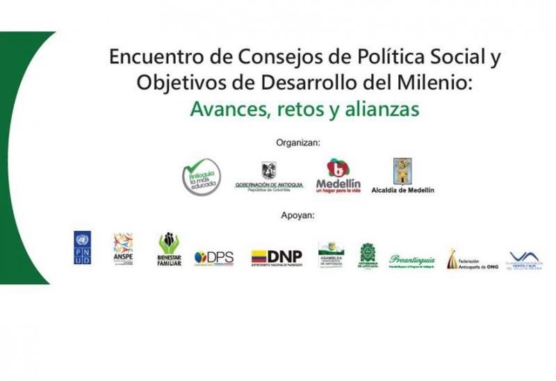 Abril de 2015 es una fecha histórica para el mundo. Naciones Unidas marcará el hito de los 1000 días para el cumplimiento de los Objetivos del Milenio, con el propósito de reducir el hambre a la mitad en todo el mundo. Por esta razón la Alcaldía de Medellín y la Gobernación de Antioquia, reunirán el 22 y 23 de abril de 2013 los 125 alcaldes de los municipios de Antioquia y miembros de sus gabinetes para concertar acciones que permitan acelerar el cumplimiento de los Objetivos de Desarrollo del Milenio, dado que los actuales períodos de Gobierno coinciden cronológicamente con el año fijado por la Organización de las Naciones Unidas para verificar su cumplimiento. Como parte de esta responsabilidad interinstitucional apoyan el evento y se suman a sus acuerdos, el Instituto Colombiano de Bienestar Familiar- ICBF, el Departamento Para la Prosperidad Social – DPS –, la Agencia Nacional para la Superación de la Pobreza Extrema - ANSPE –, el Departamento Nacional de Planeación –DNP-, el Programa de las Naciones Unidas -PNUD –, los Planes Estratégicos Norte y Sur del Valle de Aburrá, la Universidad de Antioquia, Proantioquia y la Federación Antioqueña de ONG. Para la Secretaría de Participación Ciudadana de la Gobernación de Antioquia, Beatriz White, el evento es "Una oportunidad única tanto para Medellín como para Antioquia de lograr que los alcaldes, las instituciones del orden local y nacional acordemos una ruta de trabajo concertada que permita superar la desigualdad que vivimos en el departamento". En el encuentro se evaluará el estado de los Objetivos del Milenio y se fortalecerán los Consejos Sociales de Política Social – COMPOS- de los municipios, que se constituyen por ley en la instancia responsable de revisar este tema y de articular la oferta social para superar la inequidad y la pobreza de sus territorios. El evento será transmitido vía streaming y podrán seguirlo por la red social twitter @Inclusion_Ant y los resultados finales serán publicados por las páginas www.antioquia.gov.co y por www.medellin.gov.co.   Mayores informes Gobernación de Antioquia, Comunicadora Ana María Villa 3113272148 - 3838646
