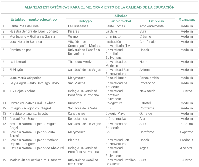 Las Alianzas Estratégicas para el Mejoramiento de calidad de la educación son un modelo de cooperación público-privada, en el que una universidad, un colegio privado y una empresa acompañan el mejoramiento de la gestión escolar en instituciones educativas oficiales de nuestro departamento.
